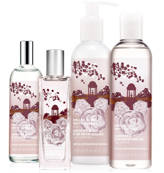 Линия English Dawn White Gardenia включает Eau de Toilette (50 мл), гель для душа (250 мл), лосьон для тела (250 мл) и парфюмерную дымку/вуаль для тела (100 мл).