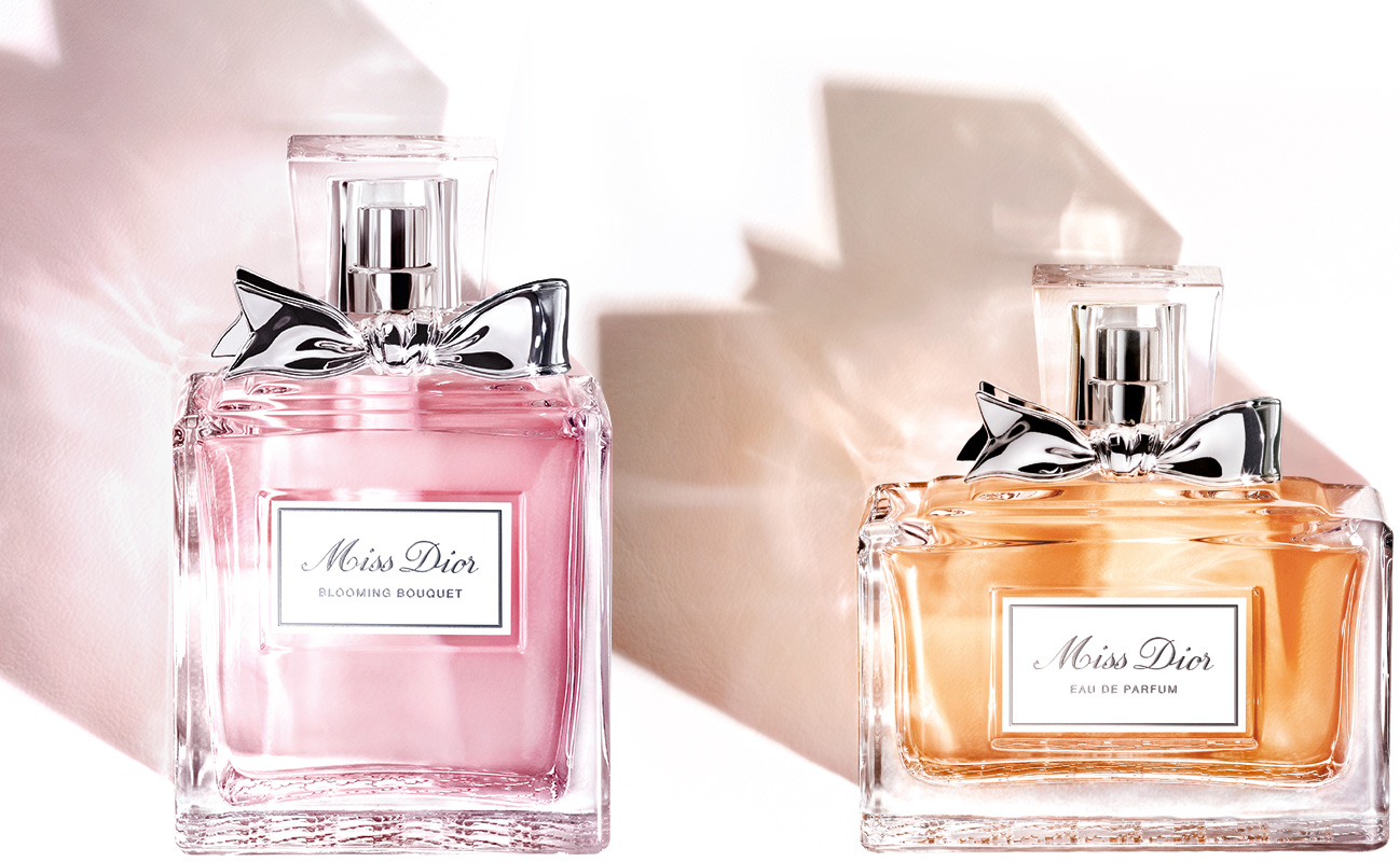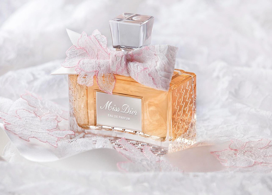 «Скроенный, словно идеально сидящий костюм», флакон аромата Miss Dior не ведает возраста. Четкие формы и выгравированный на стекле узор «гусиные лапки» являются неизменным символом всегда современного фирменного почерка Dior. Второй фирменный штрих — бант, повязанный вокруг горлышка. Нежное и воздушное цветочное кружево ручной работы окрашено и собрано лепесток к лепестку, словно частичка сказочного платья Натали Портман (Natalie Portman).